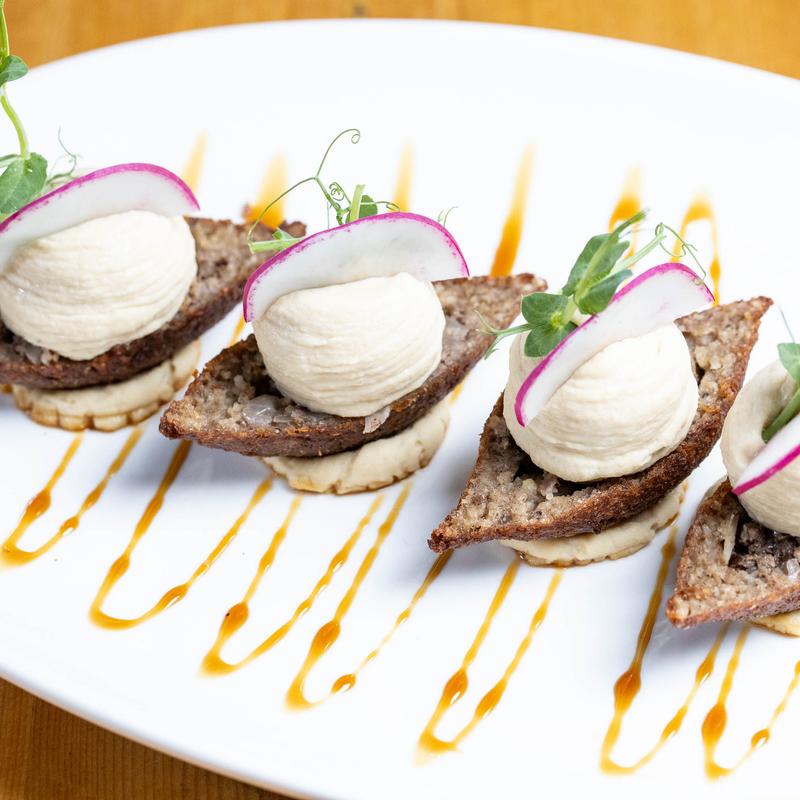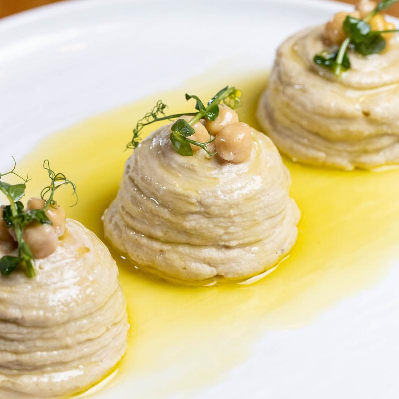 Crispy fried kibbeh topped with creamy hummus and finished with olive oil.