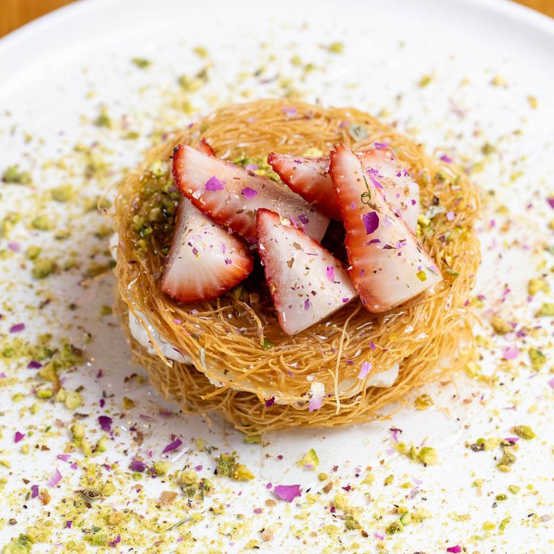Crispy knafeh filled with silky ashta cream and finished with pistachios.