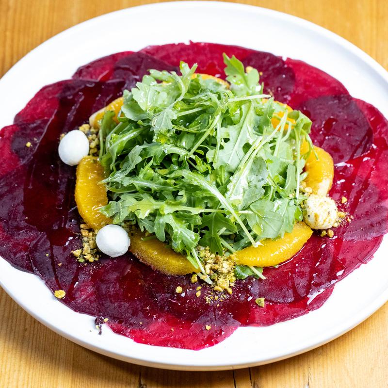 Roasted beets, baby arugula, lemon vinaigrette, goat cheese, and crushed pistachio.