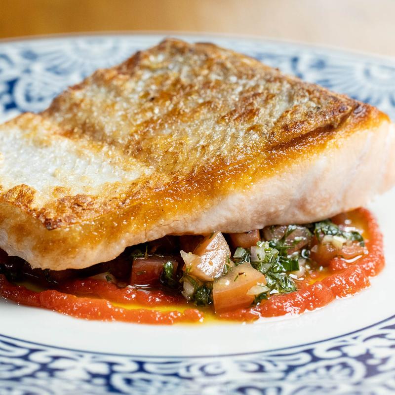 Butterflied branzino, green harissa, fresh herbs.