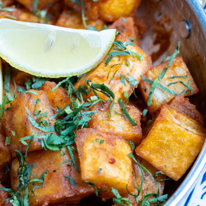 Crispy potatoes tossed with garlic, cilantro, lemon, and chili.