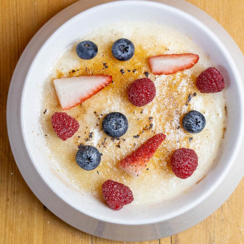 Creamy rice pudding topped with a crisp caramelized sugar crust.