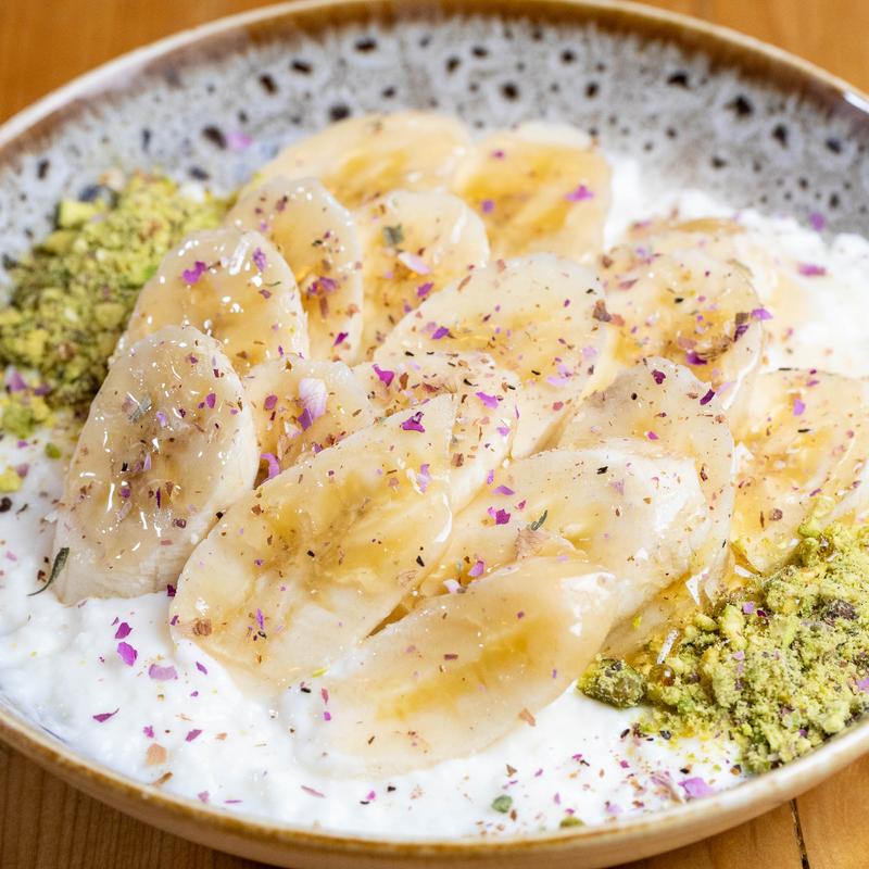 Orange Blossom cream custard, sliced banana, honey, pistachio crumbs.