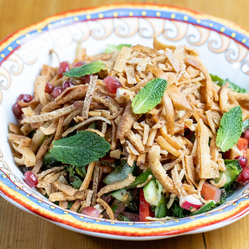 Butter lettuce, tomatoes, parsley, mint, oregano, cucumbers, radish, scallions, sumac, and crispy pita.